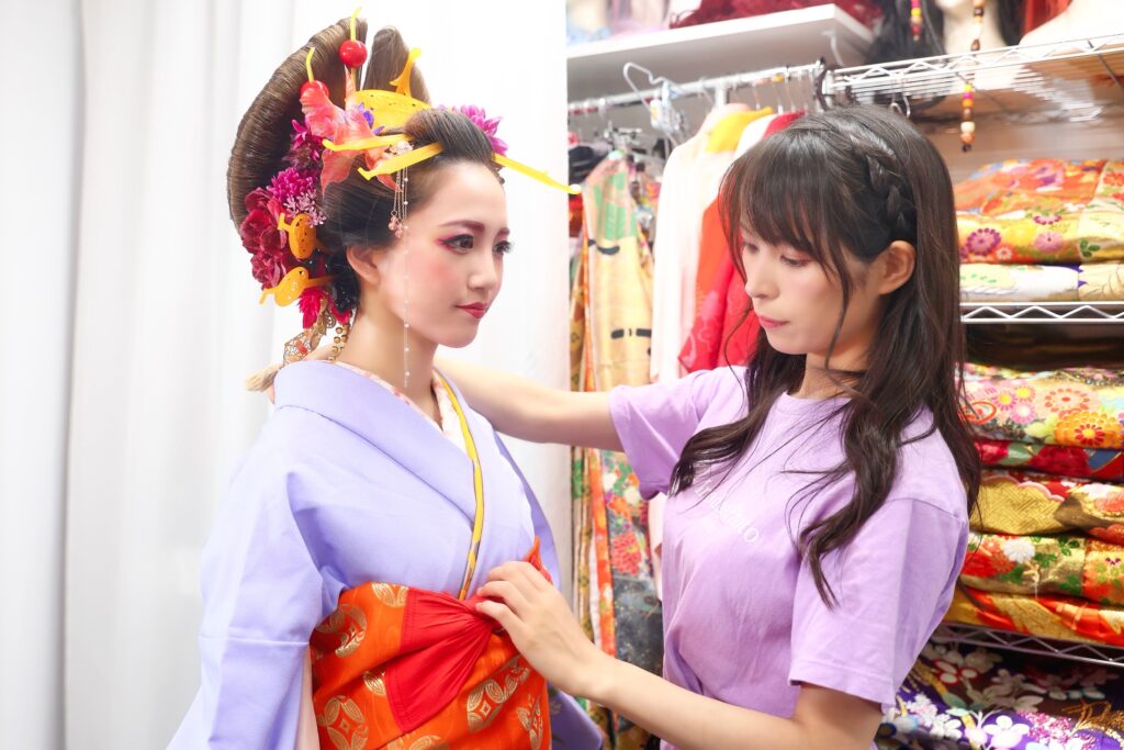 花魁プランの場合髪型は花魁特有の髪型”たて兵庫”を付けたスタイルやご自身で髪をセットし、花飾りを付けるスタイルなど自由にお選び頂けます。